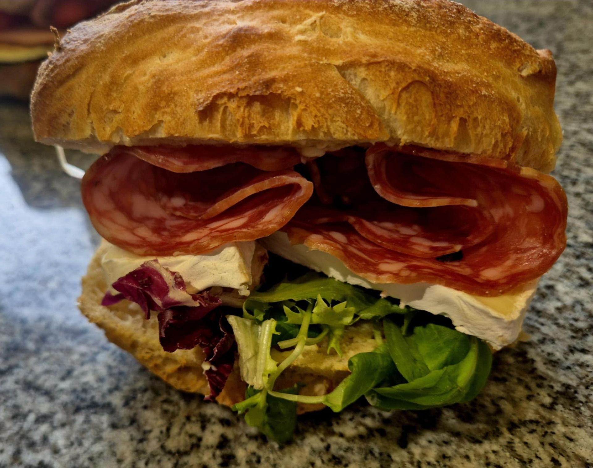 Vatten, VETEMJÖL, fermenterat VETEMJÖL, salt, maltmjöl (KORN), mjölbehandlingsmedel: E300, salami napoli (griskött, grisfett, salt, dextros, kryddor, antioxidationsmedel (natriumaskorbat), aromer, rökarom, konserveringsmedel (kaliumnitrat, natriumnitrit), starterkultur), Kolibrie Fransk Brie 33% (Pastöriserad KOMJÖLK, salt (1,8%, kraftigt saltad), mjölksyrakultur, ystenzym, mögelkultur), Smör normalsalt (pastöriserad GRÄDDE, mjölksyrakultur, salt), VETEMJÖL, vatten, fermenterat VETEMJÖL, huvudsallad färsk.
