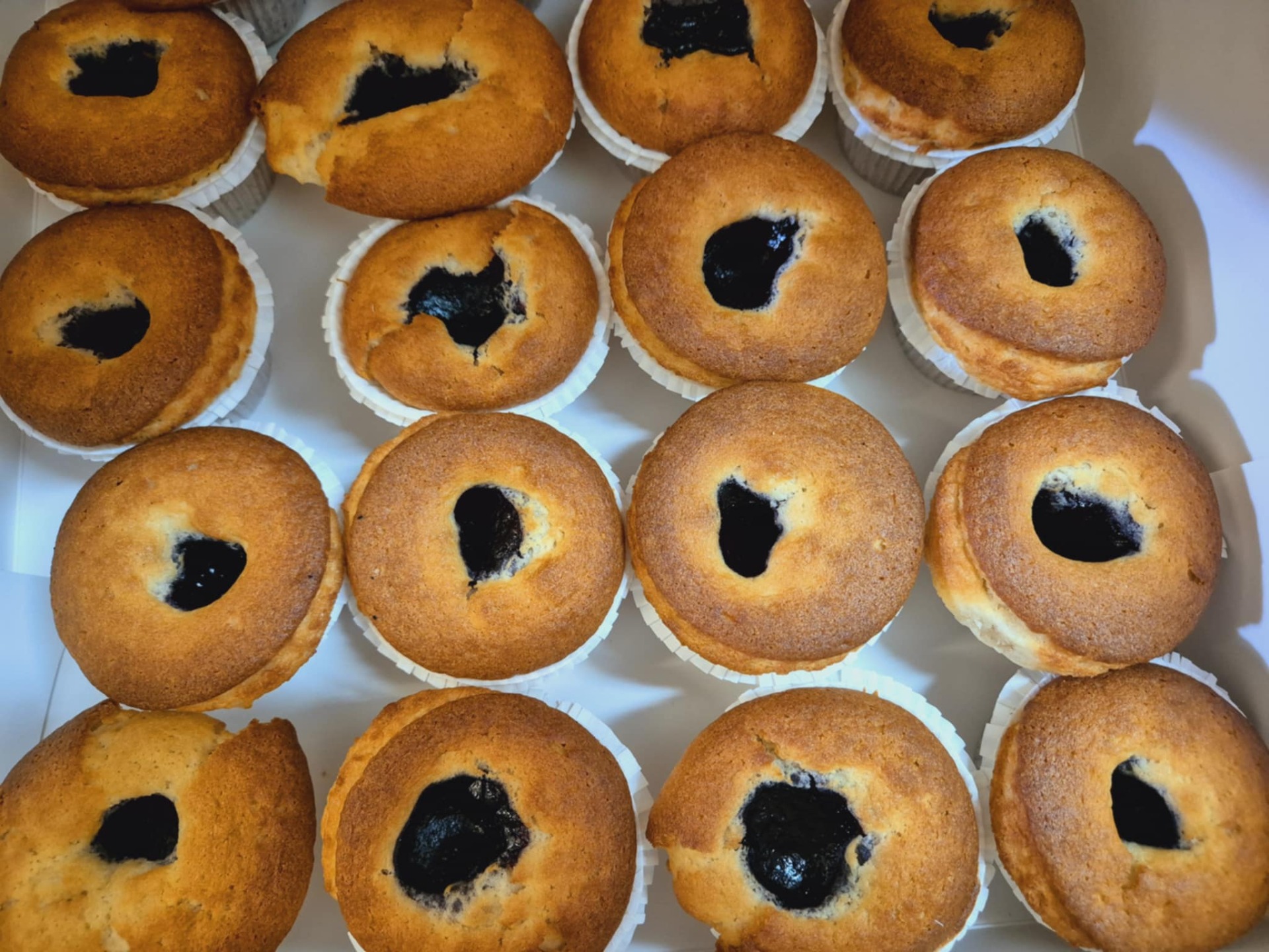 Socker, VETEMJÖL, ÄGGULA (16,1%), vegetabilisk olja (raps), vatten, blåbär (5,4%), vegetabilisk olja (kokosnöt, raps), modifierad stärkelse: E1422, VASSLEPULVER (MJÖLK), fuktighetsbevarande medel: E420, förtjockningsmedel: E406, bakpulver: (E575, E500, E450), VETEGLUTEN, emulgeringsmedel: E471, salt, glukossirap, konserveringsmedel: E202, surhetsreglerande medel: E330, arom (blåbär), MJÖLKPROTEIN, arom