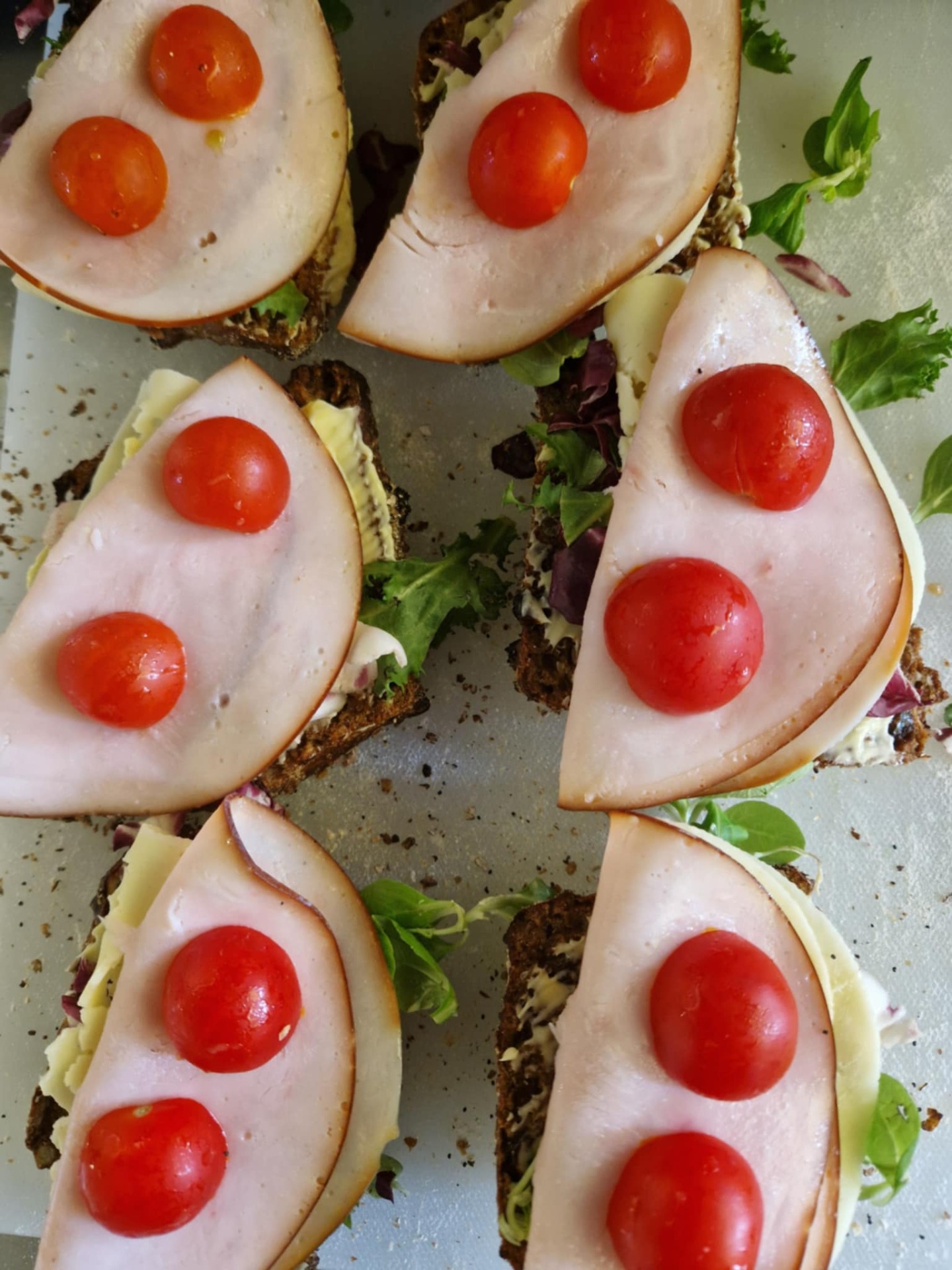 Smör normalsalt (pastöriserad GRÄDDE, mjölksyrakultur, salt), VETEMJÖL, vatten, fermenterat VETEMJÖL, huvudsallad färsk, cocktail tomat, salt, maltmjöl (KORN), mjölbehandlingsmedel: E300, , Arla Gräddis ost (Pastöriserad MJÖLK, salt, syrningskultur, ystenzym), Skinka Alspånsrökt (Svensk skinka helmuskel 89%, vatten, koksalt, antioxidationsmedel E326, E301, stabiliseringsmedel E451, potatisstärkelse, druvsocker, potatisfiber, socker, konserveringsmedel E250.)