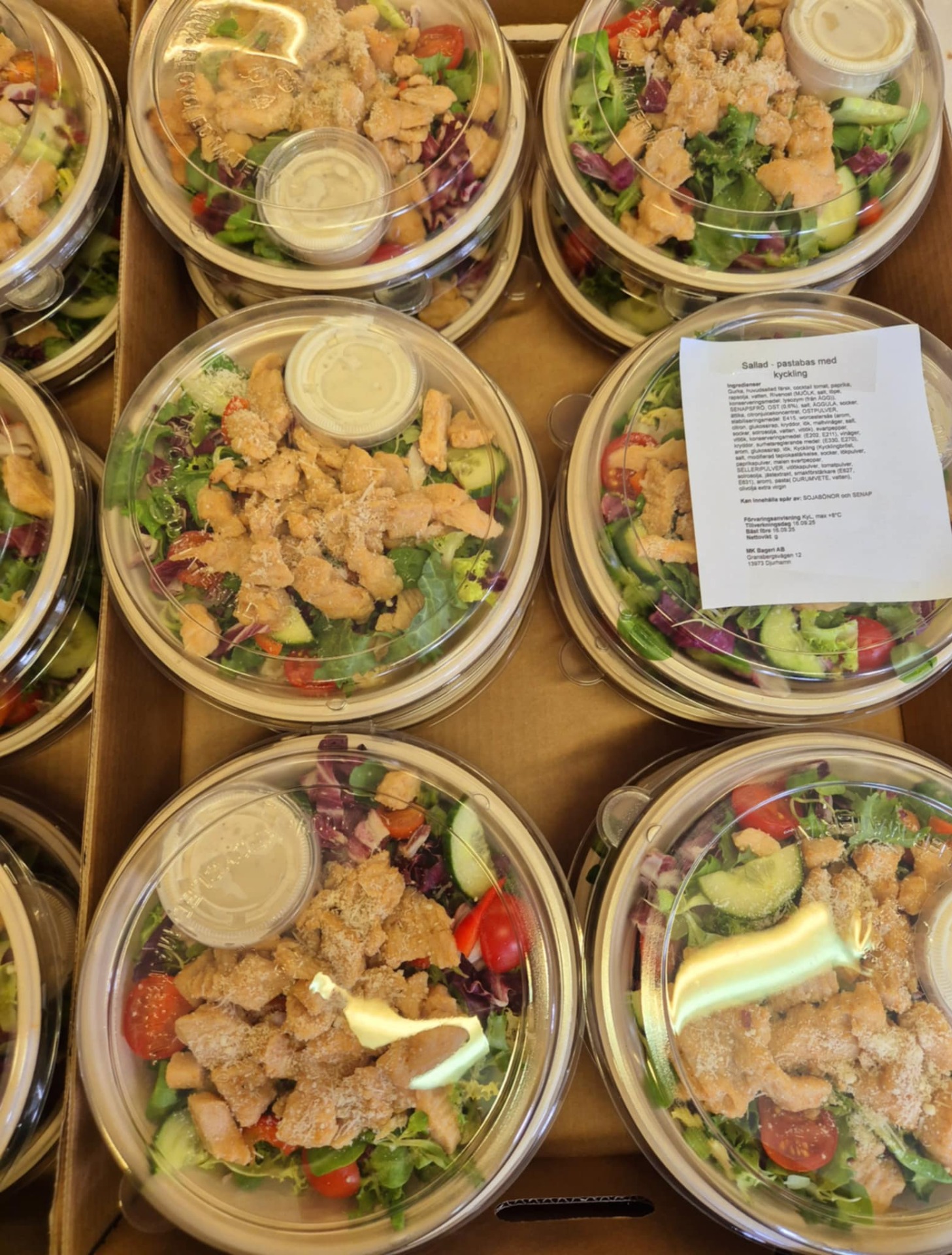 Gurka, huvudsallad färsk, cocktail tomat, paprika, rapsolja, vatten, Rivenost (MJÖLK, salt, löpe, konserveringsmedel: lysozym (från ÄGG)), SENAPSFRÖ, OST (0,6%), salt, ÄGGULA, socker, ättika, citronjuicekoncentrat, OSTPULVER, stabiliseringsmedel: E415, worcestersås (arom, citron, glukossirap, kryddor, lök, maltvinäger, salt, socker, solrosolja, vatten, vitlök), svartpeppar, vitlök, konserveringsmedel: (E202, E211), vinäger, kryddor, surhetsreglerande medel: (E330, E270), arom, glukossirap, lök, Kyckling (Kycklingbröst, salt, modifierad tapiokastärkelse, socker, lökpulver, paprikapulver, malen svartpeppar, SELLERIPULVER, vitlökspulver, tomatpulver, solrosolja, jästextrakt, smakförstärkare (E627, E631), arom), pasta( DURUMVETE, vatten), olivolja extra virgin